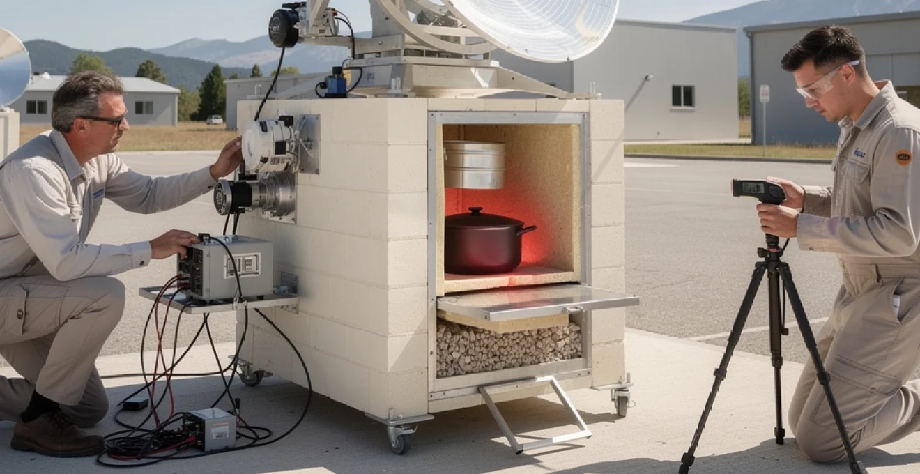 Viennent ensuite les essais en charge, avec de l’eau ou des aliments. Un protocole simple consiste à chauffer un litre d’eau de 20 °C à ébullition et à mesurer le temps nécessaire. À partir de là, il est possible d’estimer la puissance thermique utile du four solaire (en tenant compte de la capacité calorifique de l’eau), et donc le rendement global par rapport à la puissance solaire incidente. Ce type de mesure pragmatique est très parlant : si votre four met 30 minutes à porter un litre d’eau à 100 °C, vous savez immédiatement s’il est compétitif par rapport à d’autres projets de même taille.